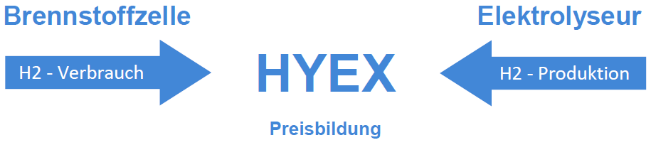 Die HYEX sorgt für ein intelligentes Wasserstoffmanagement durch direkten Handel von Wasserstoff zwischen Produzent und Endverbraucher (z.B. Ihr Wasserstofffahrzeug oder Ihr Wasserstoff-Blockheizkraftwerk). Mittels Smartphone bzw. einem Telematiksystem melden die Endgeräte (Brennstoffzellen) in regelmäßigen Abständen anonym ihren aktuellen Verbrauch und die Produzenten (Elektrolyseure oder Biogasanlagen) ihre aktuelle Wasserstoffproduktion an die HYEX. Entsprechend Angebot und Nachfrage ermittelt die HYEX einen fairen Preis, der wiederum an die Endgeräte übermittelt wird. In einem Zeitfenster können Sie dann entscheiden, ob Sie zu diesem Preis später nachtanken oder lieber abwarten möchten. An wind- und sonnenreichen Tagen wird der Preis für Wasserstoff fallen, im Gegenzug wird er an wind- und sonnenarmen Tag steigen. So reguliert der Preis ein Überangebot oder Mangel an Wasserstoff auf ein vernünftiges Niveau.